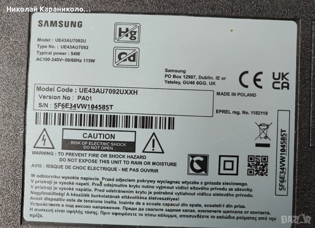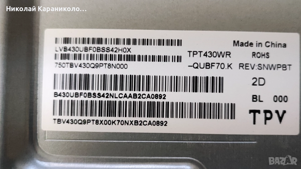 Продавам тв SAMSUNG UE43AU7092U за части по причина-дефектирала матрица/TPT430WR-QUBF70.K.Редовни съответно: