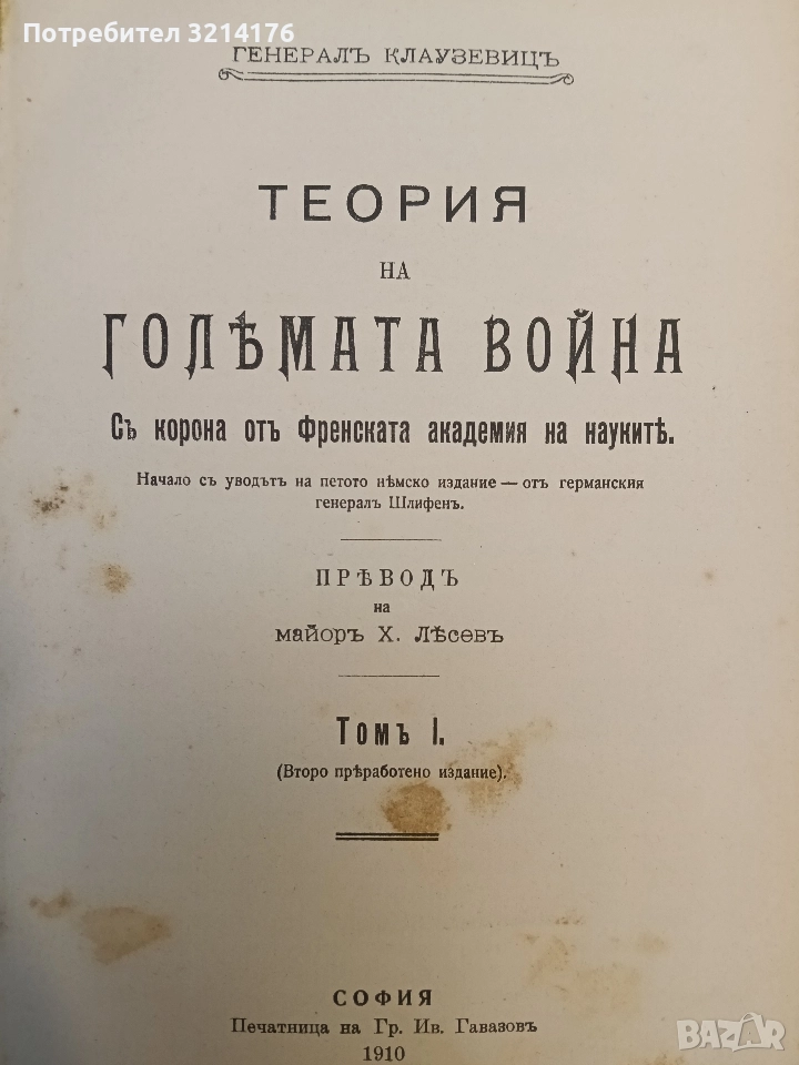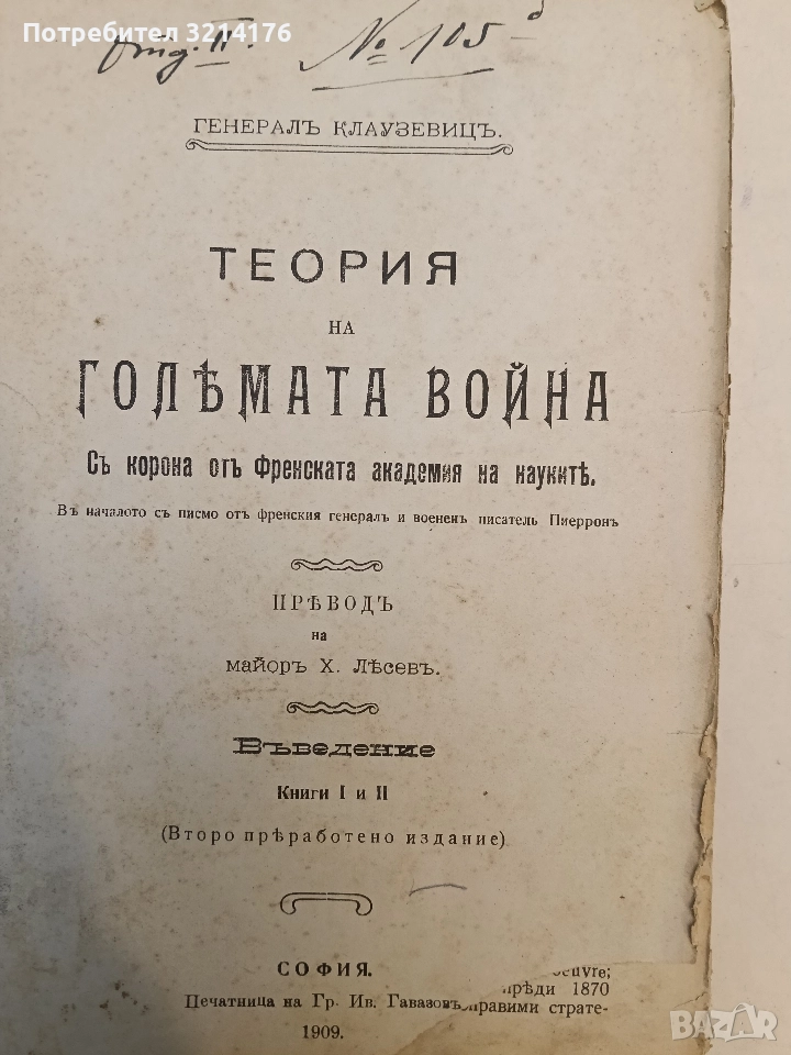 Теория на голямата война. Въведение. Книги 1-2 (1909) / Томъ 1. Книга 3 (1910) - Карл фон Клаузевиц 109лв. (Общо 285стр., зацапани корици, вътрешно книжно тяло в добро сътояние)