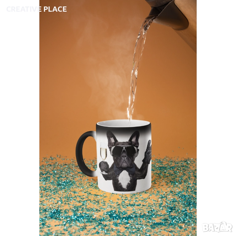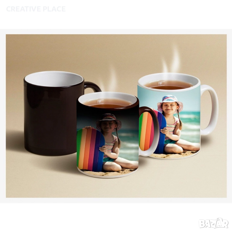Черна чаша притежаваща магически ефект - когато чашата е празна и студена е черна на цвят. Щом сипете гореща напитка или затоплите чашата, тя започва да изсветлява и се показва напечатаното изображение.