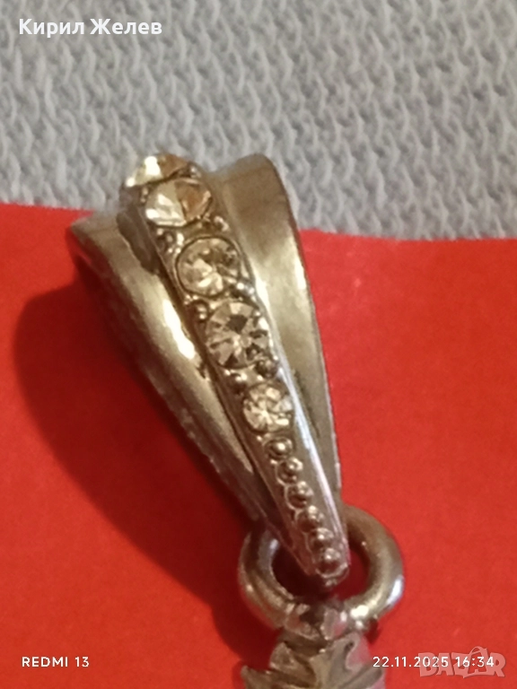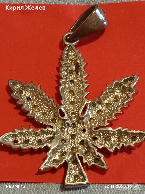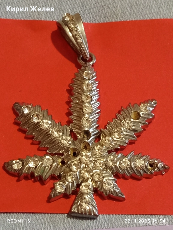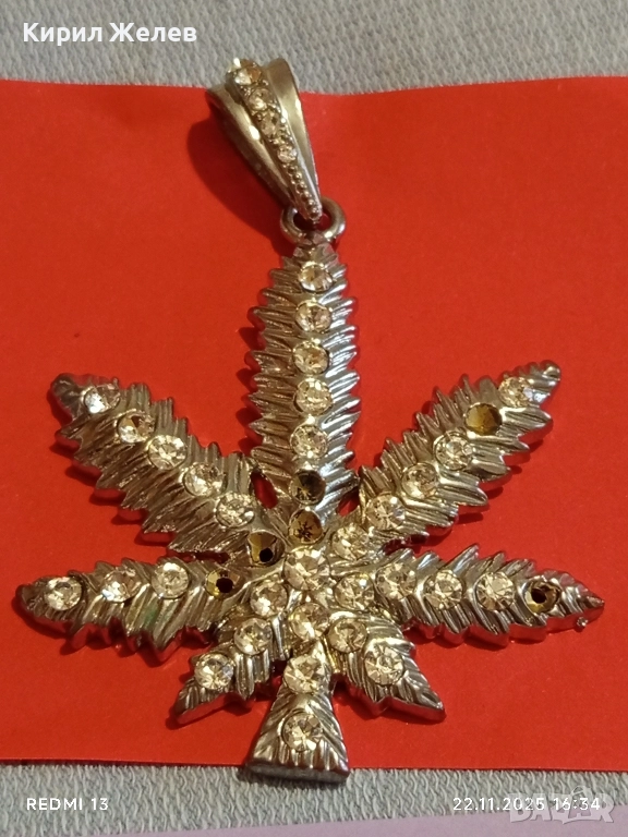 СРЕБРИСТ МЕДАЛЬОН ЛИСТА от МАРИХУАНА с КРИСТАЛИ 16415