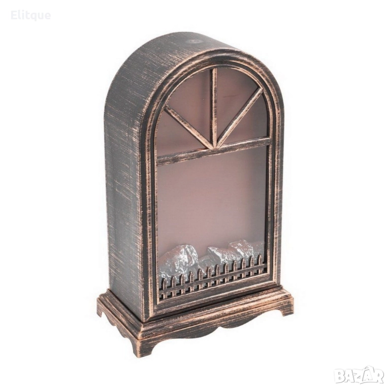 Тип: LED фенер-камина за вътрешна употреба; Светлинен източник: 3 топлобели LED диода с трептящ пламъков ефект; Управление: бутон Вкл./Изкл.; Поставяне: свободно стоящ или стенно окачване; Захранване: Батерии/USB (не са включени); Размери (Ш × Д × В): 25 × 14 × 40,5 см; Материали: пластмаса, стъкло; Цвят/финиш: мед, античен дизайн; Безопасност: без нагряване, без дим и искри; само за декорация; не е играчка; Гаранция: 12 месеца.