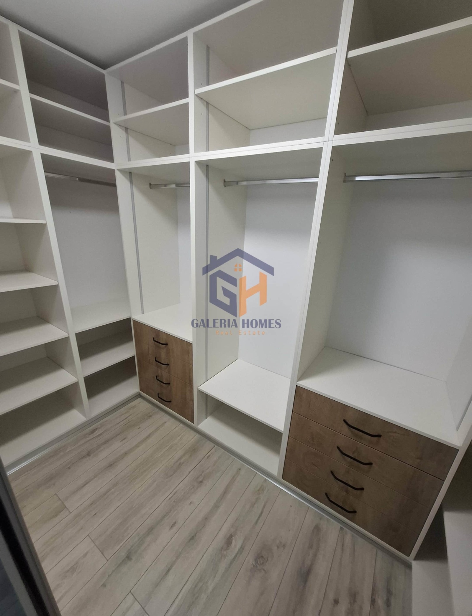 Разпределение: входно антре, хол с кухненски бокс и трапезария, две широки спални (едната с дрешник), две тераси, две бани с тоалетна и мокро помещение.