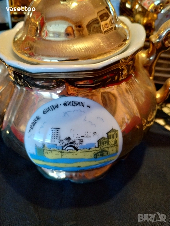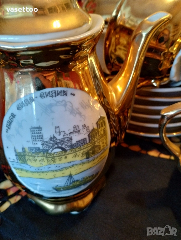Позлатен сервиз за чай и за кафе на старата видинска фабрика включващ: шест чаени чаши 5.5/10 см. с вместимост около 220 мл., шест подложни чинийки 15 см., шест чаши за кафе 3.5/7 см. и вместимост 90 мл., шест подложни чинийки 11 см., кана за кафе и захарница. На една от чашите за чай има фабрична забележка на ръба.