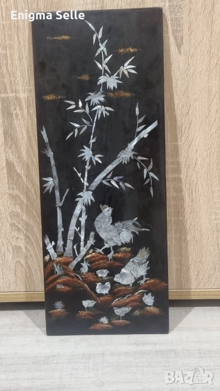 Красива китайска лакирана дървена картина, инкрустирана със седеф, изобразяваща петел с кокошки и пиленца. Размери: височина 48,5см, дължина 19 см, ширина 1 см.