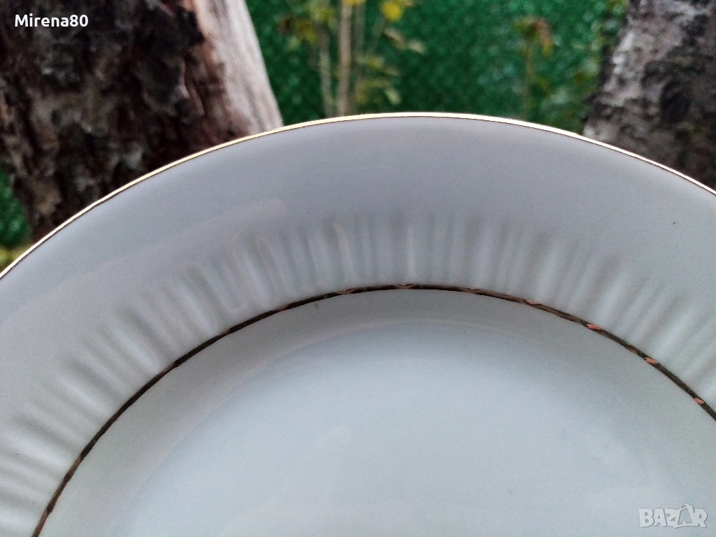 Много красиви и елегантни чинии на Китка - Нови пазар. Бял порцелан със златен кант и богт релеф по борда. Диам. 19 см, отлично състояние.