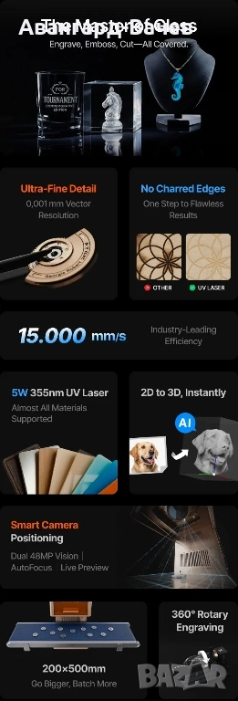 Като най-добрият лазер за почти всички материали, UV лазерът прави това, което другите не могат – улавя фини детайли дори върху кристал, керамика, акрил, ахат и други, предлагайки най-широката съвместимост с материалите досега. С UV лазерите единственото ограничение е въображението.