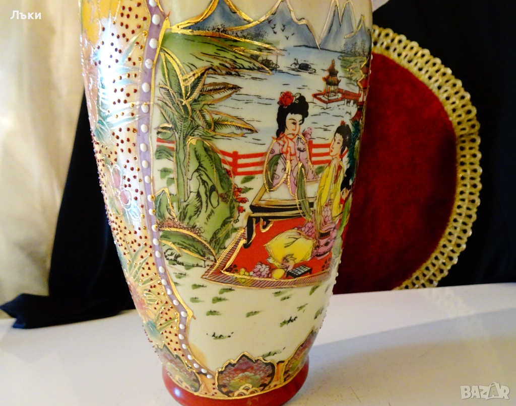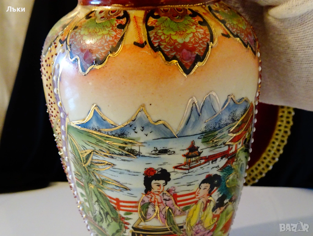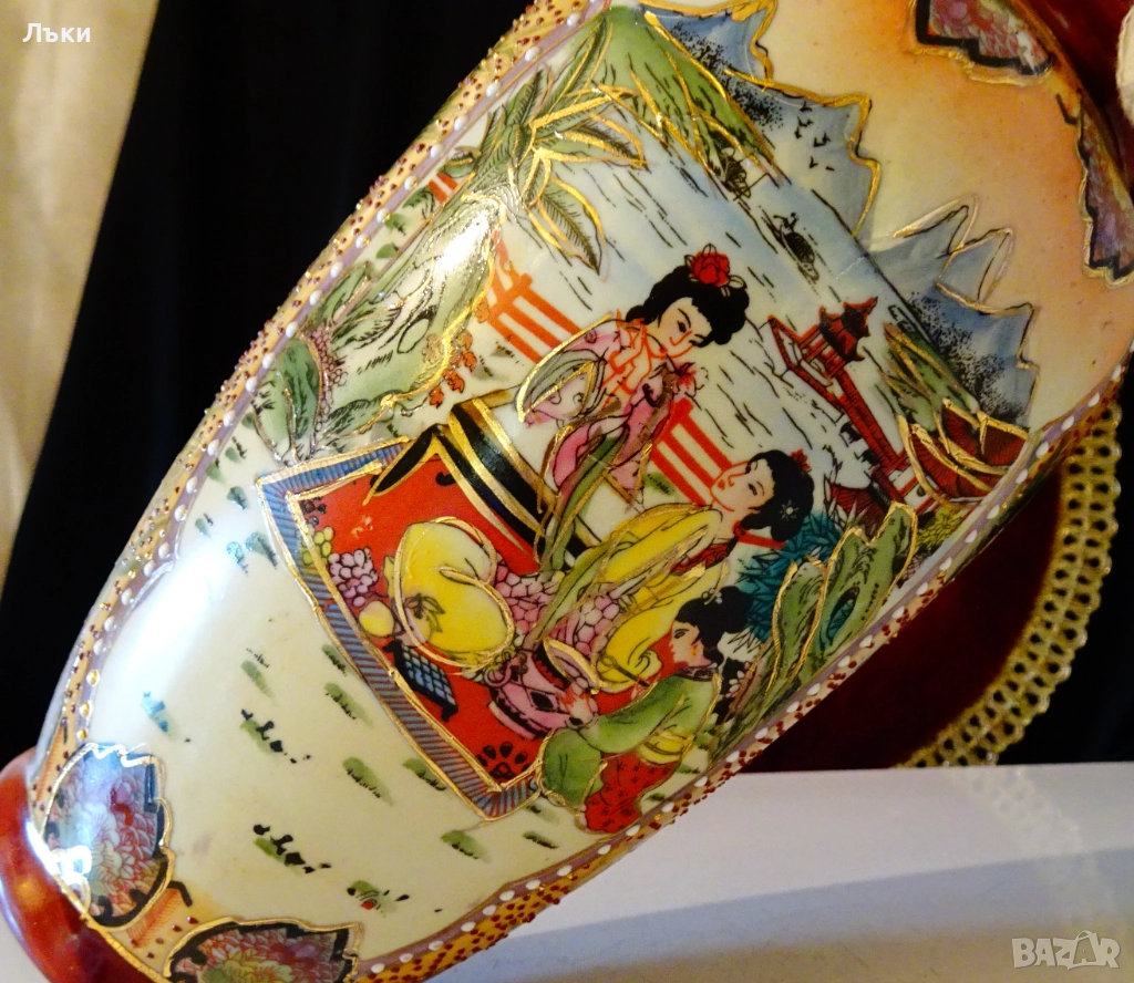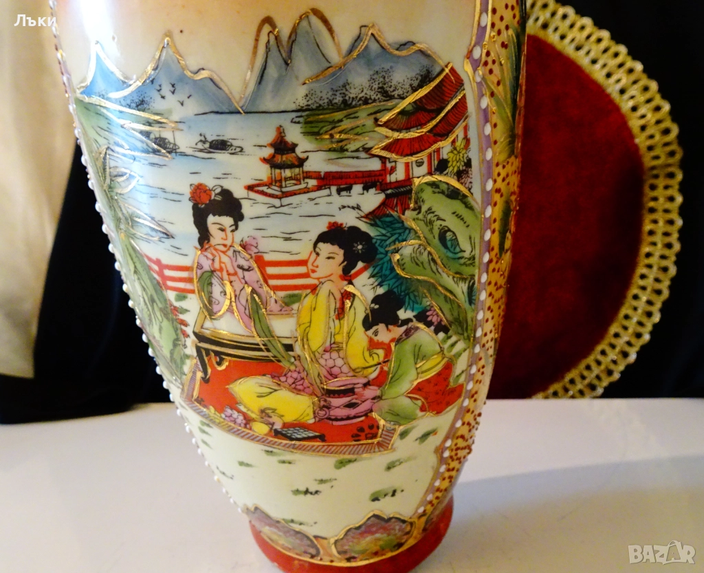 порцелан,ръчно рисуван в стил Satsuma с гейши,красив пейзаж,изпъкнали цветни емайли Moriage,пъстри цветя и 24