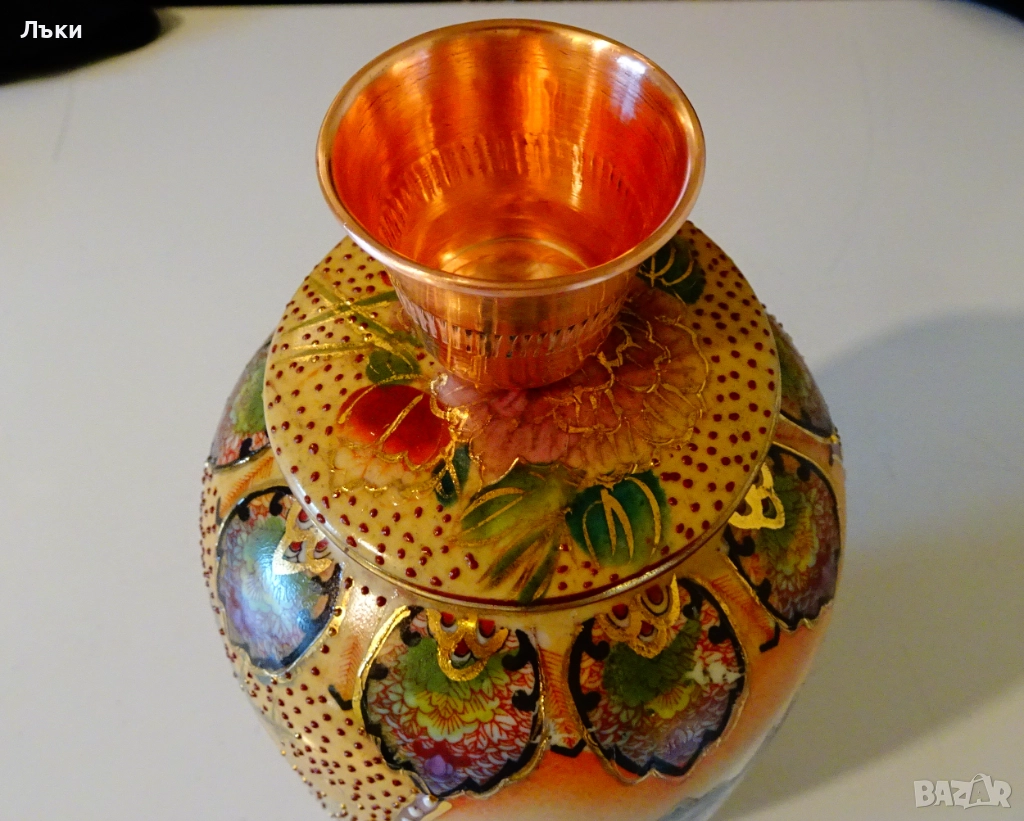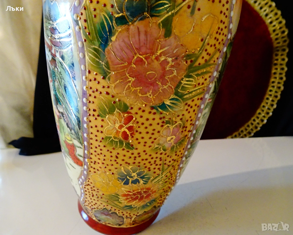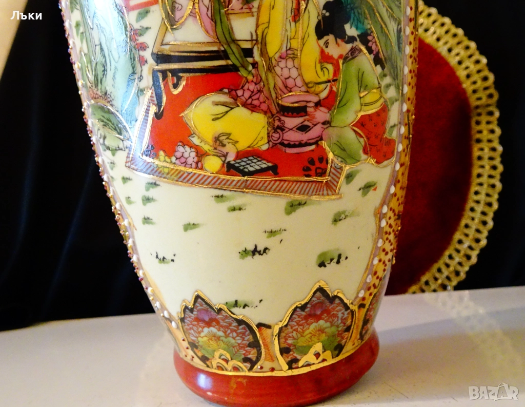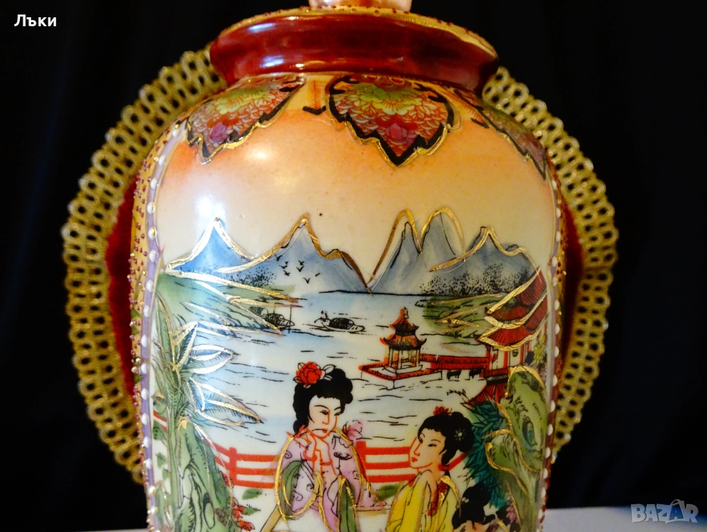 порцелан,ръчно рисуван в стил Satsuma с гейши,красив пейзаж,изпъкнали цветни емайли Moriage,пъстри цветя и 24
