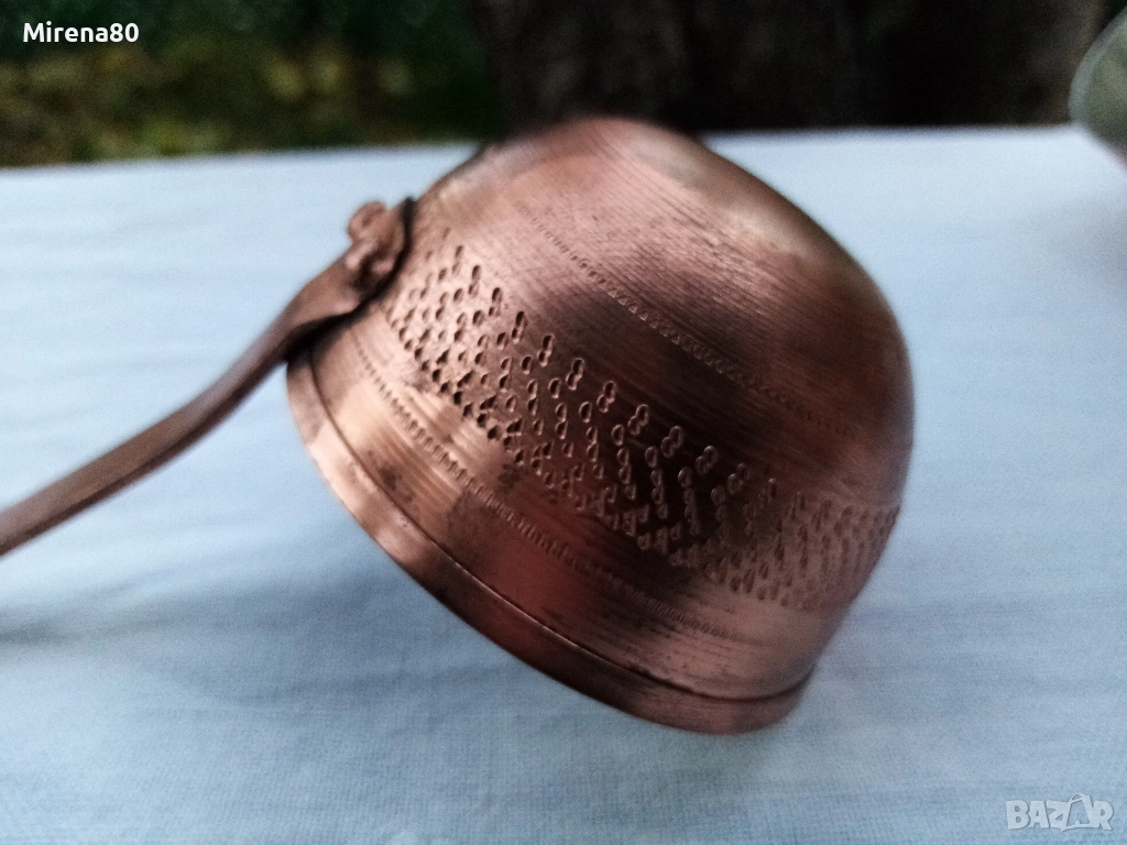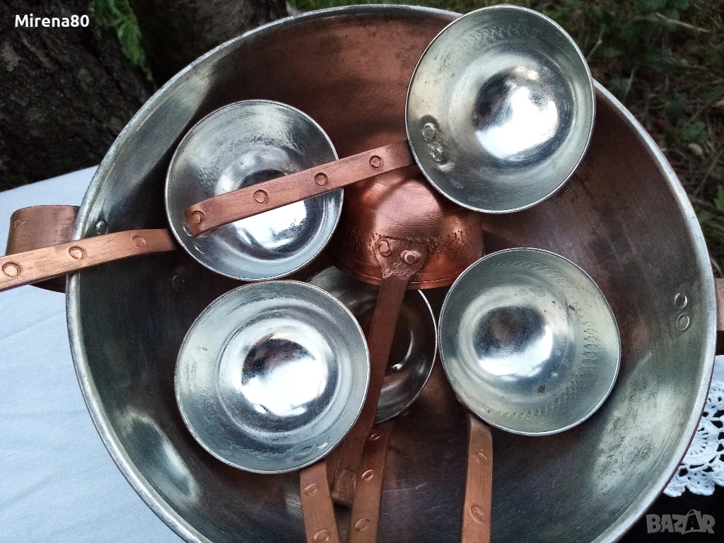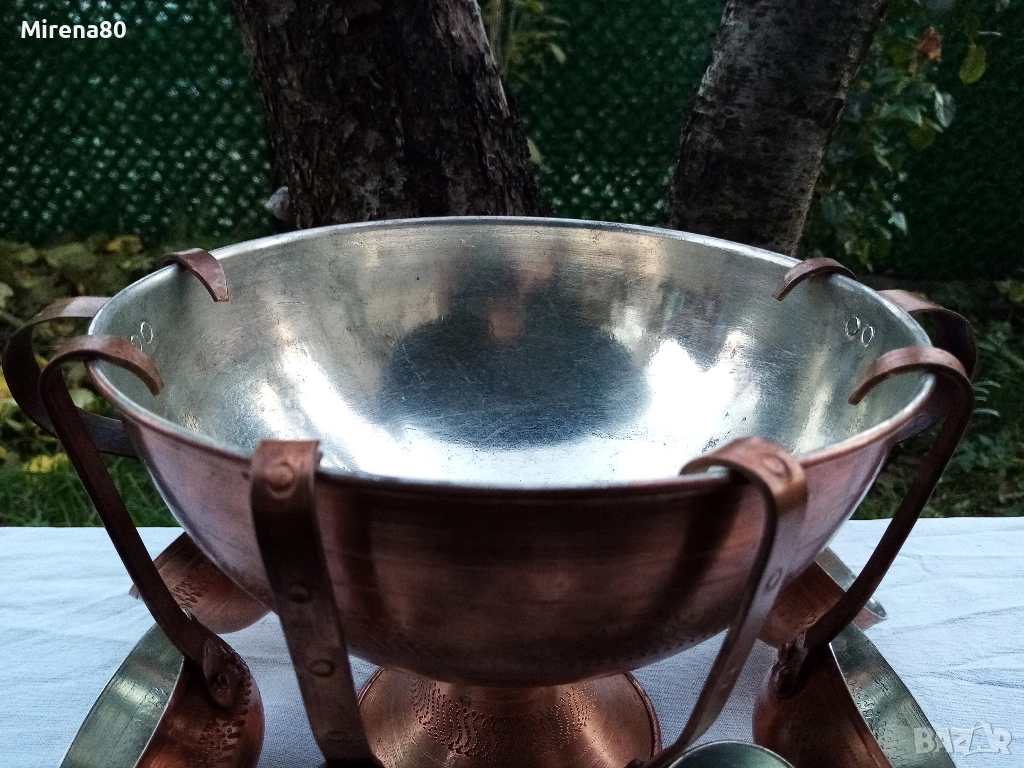 Изработен от мед, подходящ за вино, пунш и други напитки. Ефектен и оригинален, с него определено ще впечатлите всеки гост. Купата е с диам. 20 см. и вис. 16 см, а всяко черпаче е с вместимост 100 мл. Общо бтегло - 740 гр. Страхотна майсторска изработка ! Калайдисан, готов за употреба.