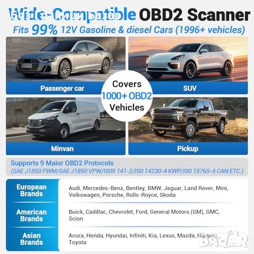 Поддържа почти всички автомобили след 1996 г. – автоматично разпознава VIN