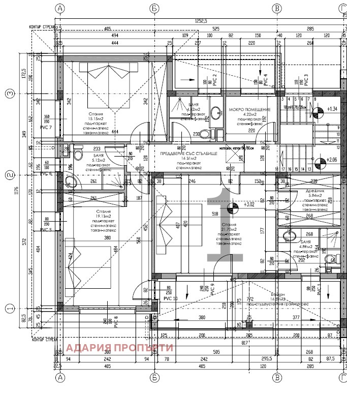 -На втория етаж на обекта са предвидени три спални, три бани, като едната