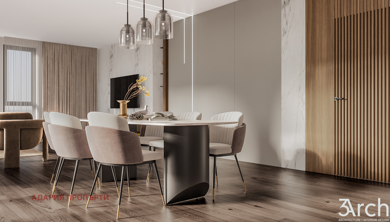 отвън, дневна с трапезария и кухненски бокс и тоалетна. Светлата височина на