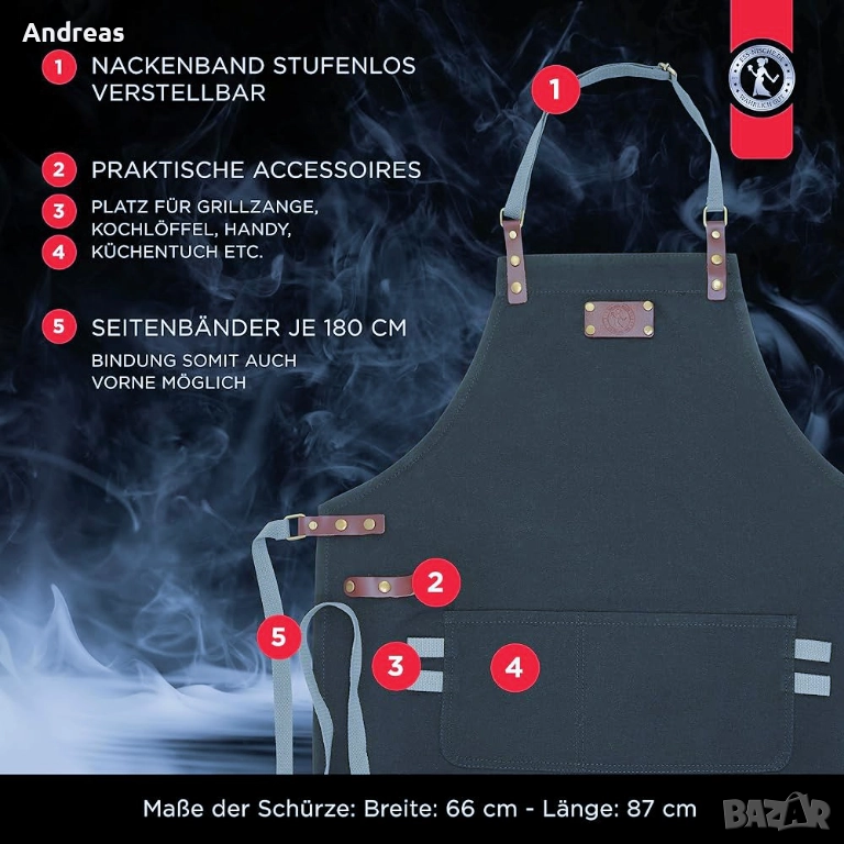 Престилка за готвене и печене на скара за мъже и жени. Чудесен подарък за мъже, жени, баба или дядо - екстра дълга престилка в антрацит. Немска марка. Като нова. Универсален размер, връзки отпред или отзад. Гъвкава каишка за врата. Може да се пере в пералня на 40°C, като предварително отстраните кожените апликации. 70% памук, 30% полиестер.