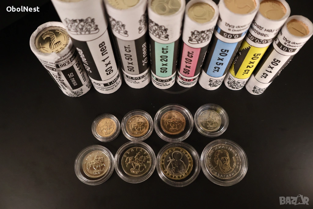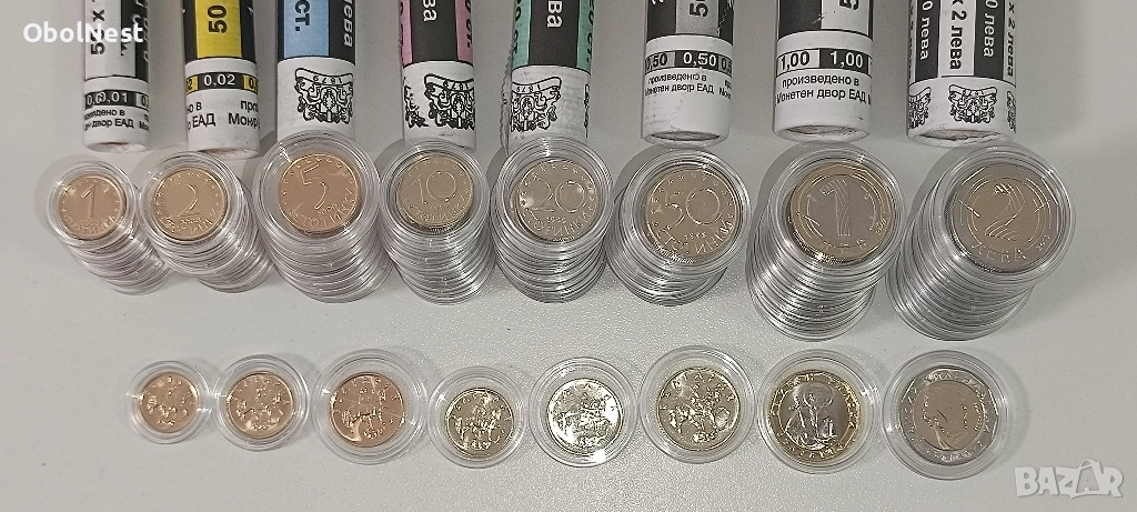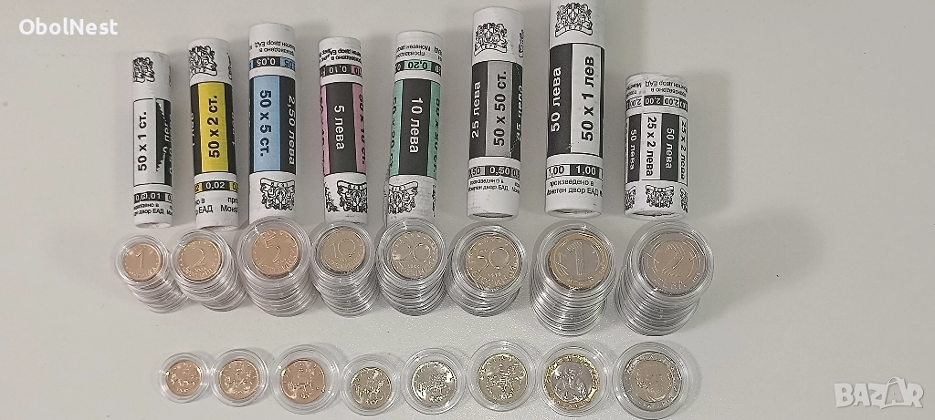 Пълен сет (В КАПСУЛИ) от 8 броя български разменни монети в състояние UNC, директно извадени от фабрично запечатани ролки на Монетен двор.