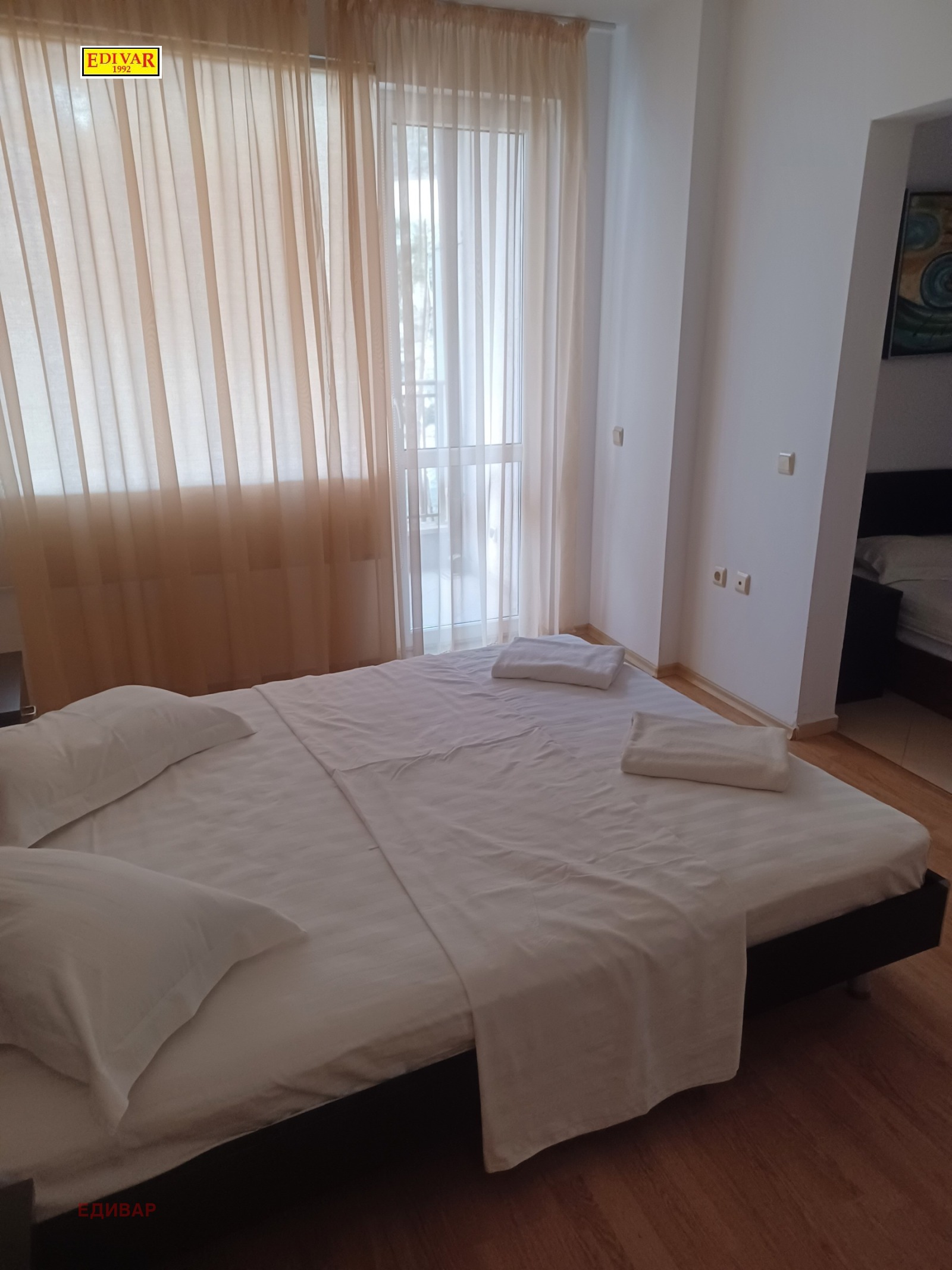 НА ПЕШЕХОДНО РАЗСТОЯНИЕ ОТ ПЛАЖА!!! ИЗКЛЮЧИТЕЛНО ИЗГОДНА ЦЕНА!!! ЕДИВАР предлага обзаведен и оборудван двустаен разширен апартамент, състои се от коридор, дневен тракт с кухненска част,просторна спалня с помещение към нея-оборудвано с единично легло,две бани с тоалет, две тераси. Невисока годишна такса поддръжка- 700е- включваща поддръжка на два басейна, детски кът, общи части сграда, зелени площи, контролиран достъп, интернет и др. ЕДИВАР ОСИГУРЯВА ФИНАНСИРАНЕ ЧРЕЗ СЪДЕЙСТВИЕ ЗА КРЕДИТИ. ПАРТНЬОРСКИ ДОГОВОРИ С ВОДЕЩИ БАНКИ. КОНСУЛТАНТ: СТОЯН ЕДИСОНОВ, Моб/Viber/WhatsApp- 0887070266; 0888143204. КУПИ- ПРОДАЙ ИМОТ ЧРЕЗ ЕДИВАР!