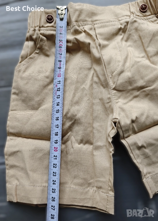 Oфициален бебешки комплект за момче, който включва риза с къс ръкав, къси панталони, тиранти и папийонка. Подобни комплекти са подходящи за официални поводи като сватби, кръщенета или рождени дни.