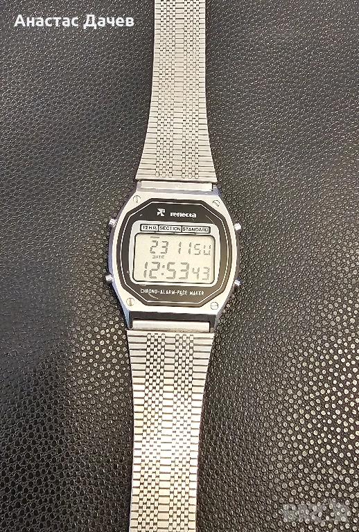 Доста труден за намиране винтидж часовник REFLECTA. Всички функции на часовника работят перфектно и със точност. Много запазен за годините си екземпляр. Производство 1980-1981г.