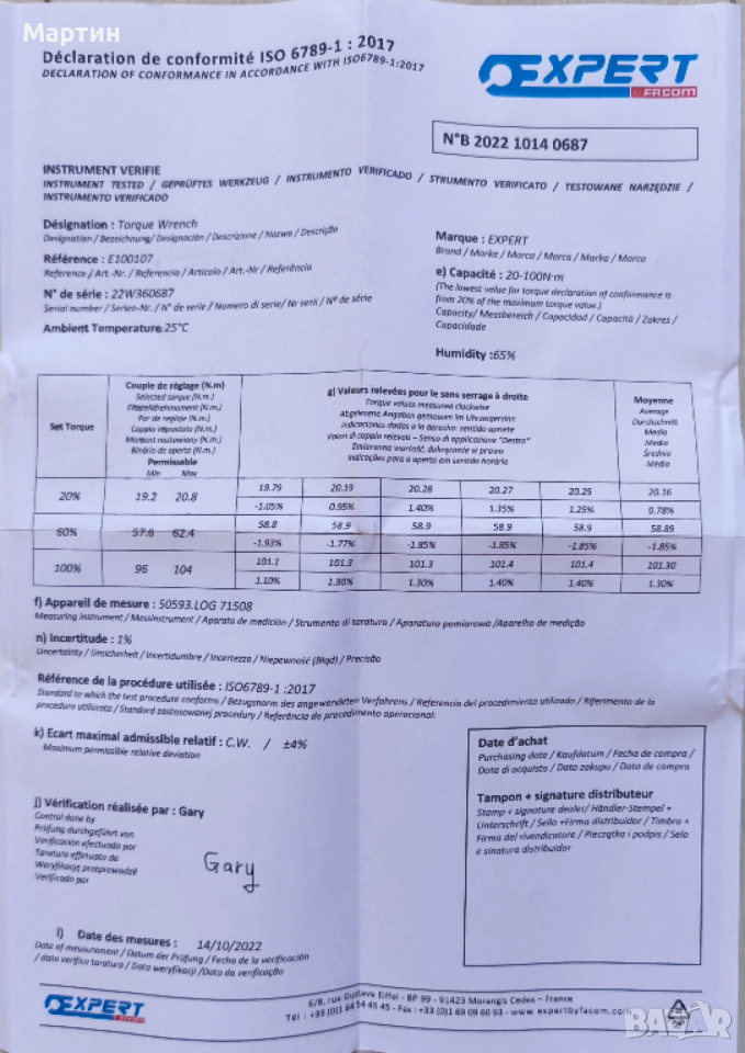 Expert 1/2 ", 20-100 Nm, 400 мм, ISO 6789 - ключът е чисто нов, никога не е използван. Със сертификат за изпитване. Възможно е лично предаване на територията на гр. София.