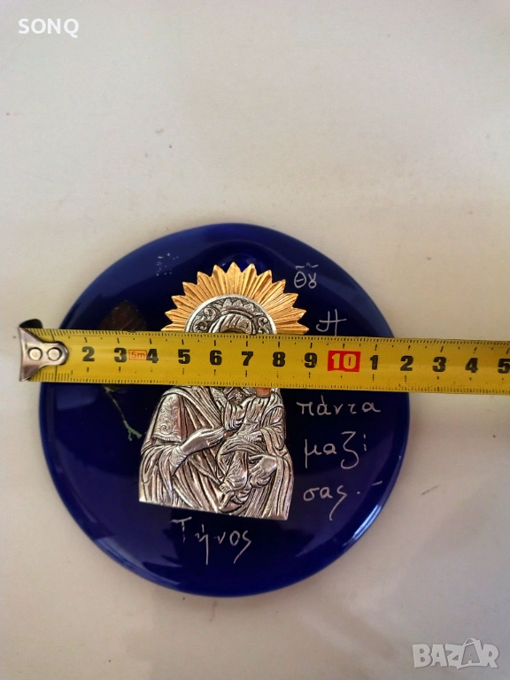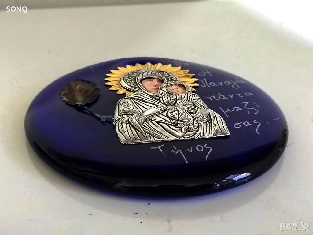 Много красива изработка върху дебело синьо стъкло. Само за вярващи хора.