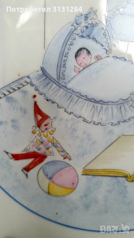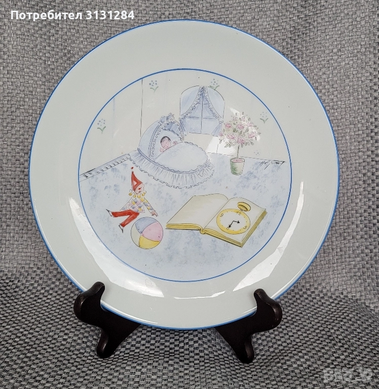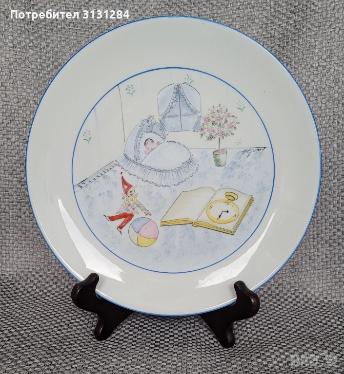 Красива декоративна чиния със сладка детска тема, ръчно рисувана от френски художник с автограф Размер 24 см