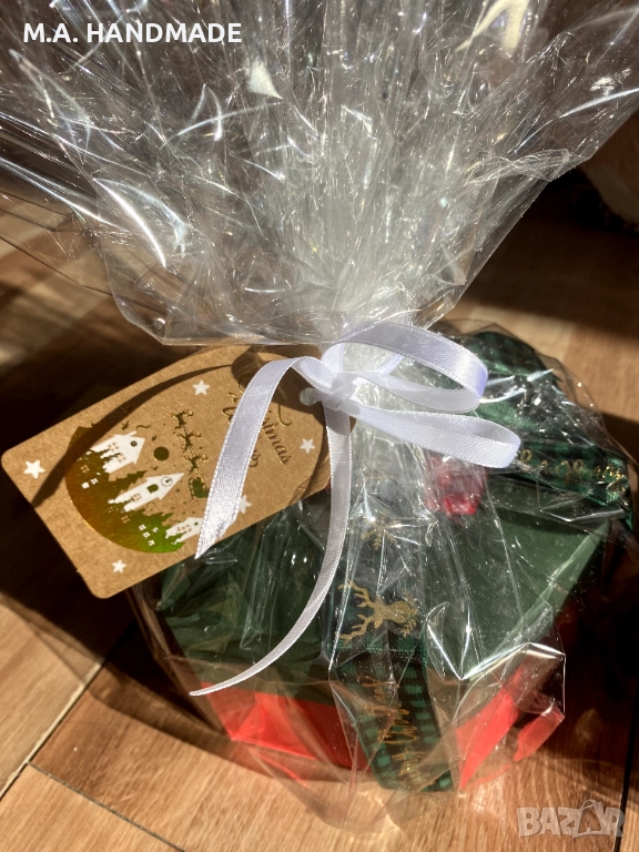 - Коледна опаковка с целофан, съдържаща коледен таг, панделка 🎁
