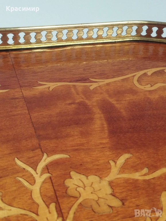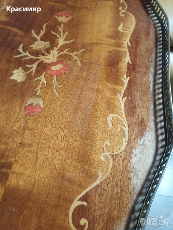 Повърхността на дървото е украсена с интарзия - изящна и изискана техника на вграждане на дървени елементи в основния материал. По дължина има изсветляване на фурнира и пукнатинка до едната дръжка.