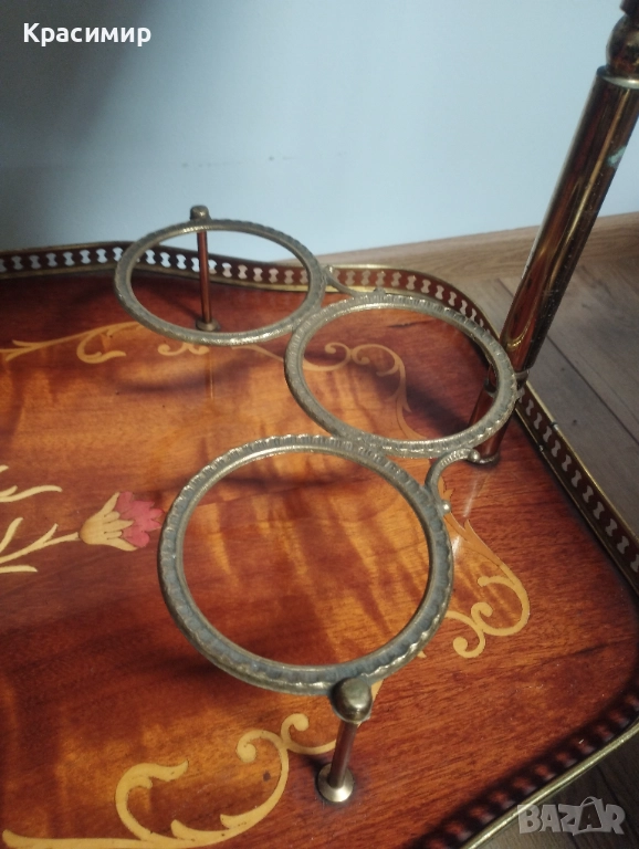 Долното ниво разполага със специална месингова конструкция за подреждане на бутилки, което я прави идеална за сервиране на напитки.