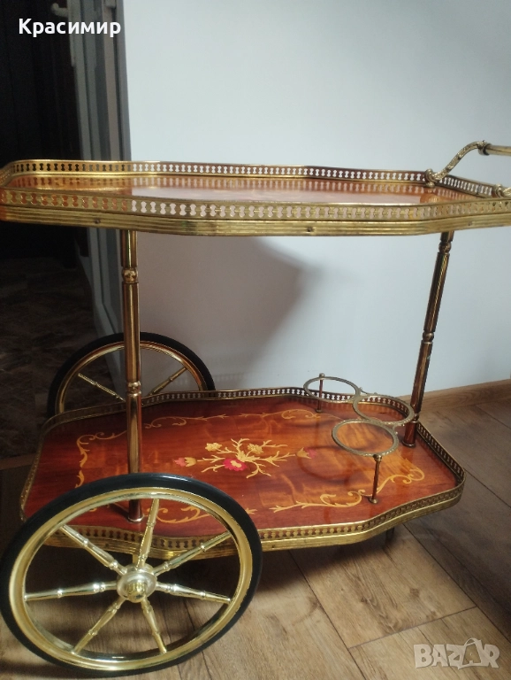 Тази старинна количка за сервиране е уникална комбинация от изящество, функционалност и традиционен дизайн, което я прави не само предмет за употреба, но и изкуство.