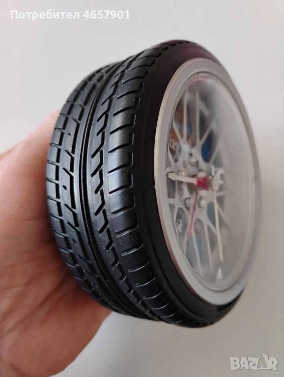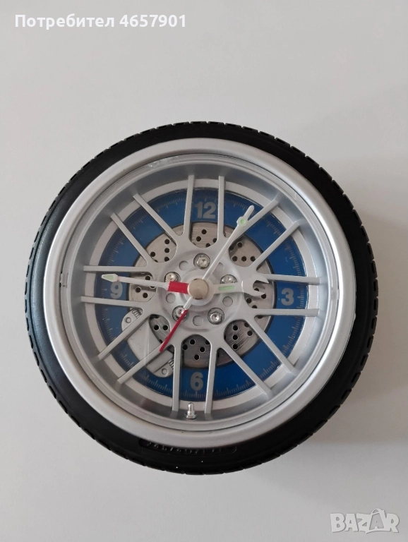 Настолен часовник-будилник във форма като автомобилна гума. Работещ. Тих механизъм. Диаметър 10см. Пластмаса/кварцов часовников механизъм, работи с 1 батерия.