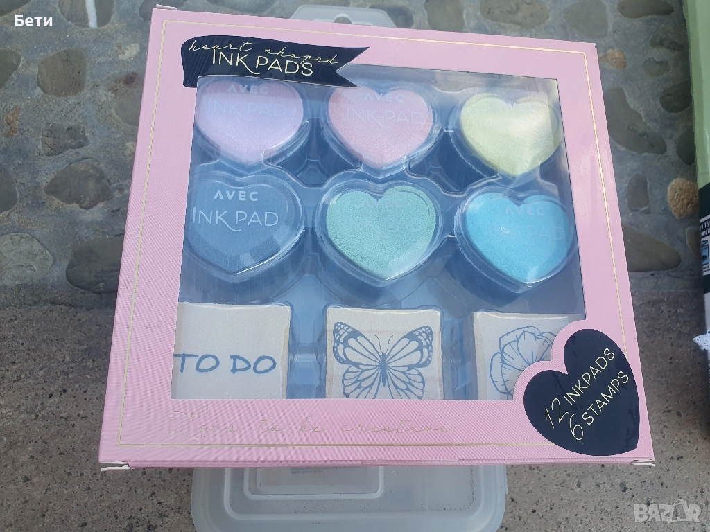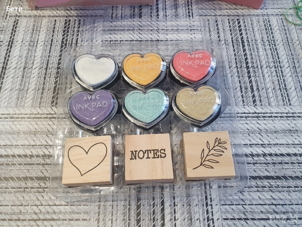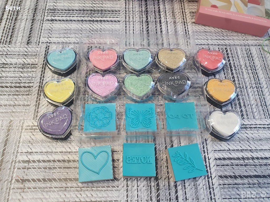 Комплектът съдържа 6 броя различни видове дървени печати, всеки с размер 4х4 см, и 12 броя различни цветове мастилени тампони. Подходящи са за ембосинг и други техники за отпечатване на изображение върху хартия, картон, дърво и други. Изпращам САМО с Еконт с опция преглед.
