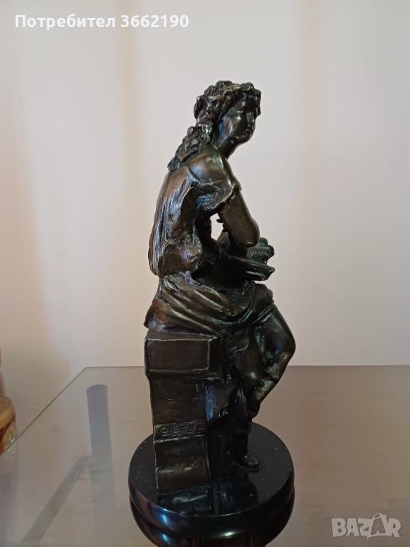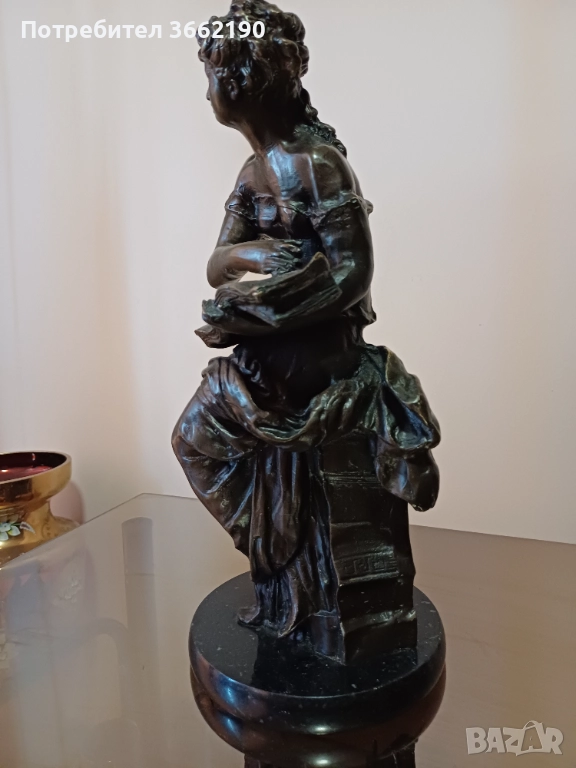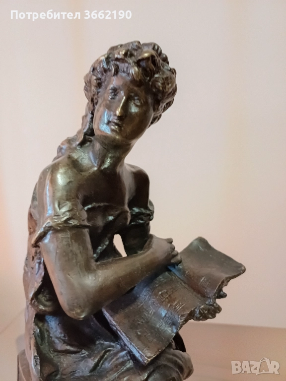Стара, бронзова фигура на антична жена, държаща книга.Без забележки.Висока е 35 см. без основата и и ма 15 см. диаметър. Част от лична колекция.Моля, разгледайте и другите ми обяви!