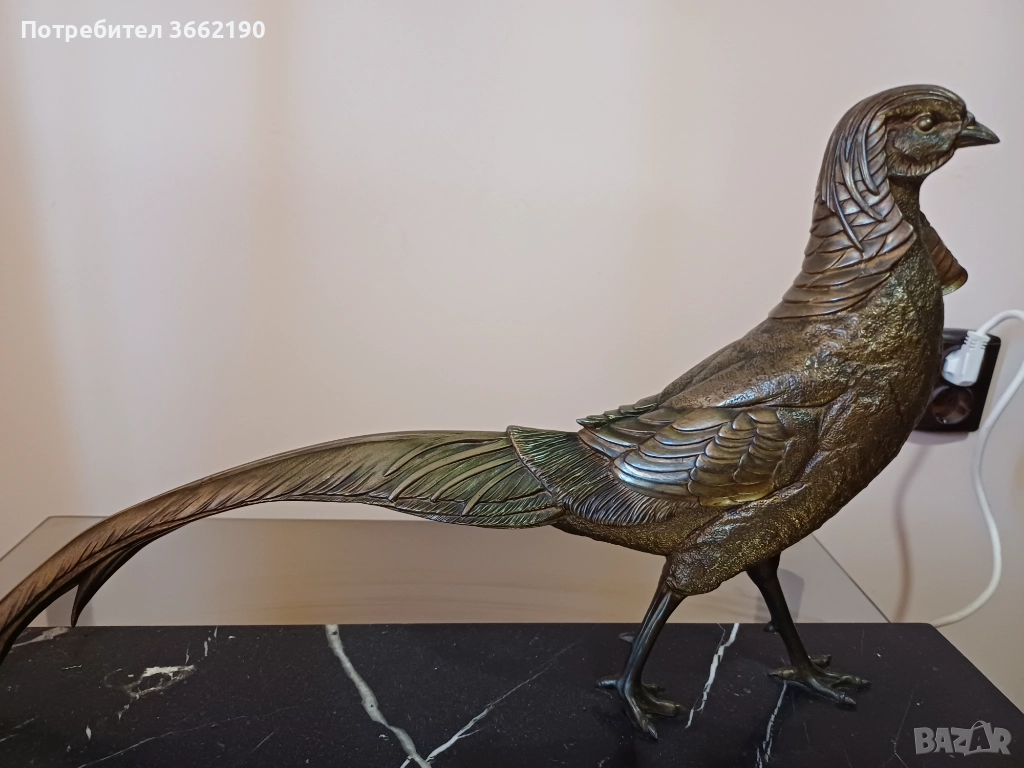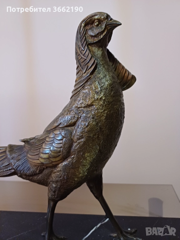 Много голяма фигура на фазан.Жълт бронз.Отлично състояние. Височина без основата 38 см. и дължина 45 см. Тежка и стабилна мраморна основа. Част от личната ми колекция. Моля, разгледайте и другите ми обяви!