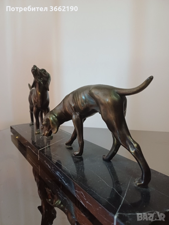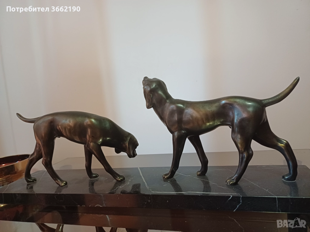 Много красива двойка ловни кучета от плътен бронз. Изящна изработка и отлично състояние на фигурите. Височина без поставката - 16,5 см. и дължина - 44 см. Без забележки са, част от личната ми колекция. Моля, разгледайте и другите ми обяви!