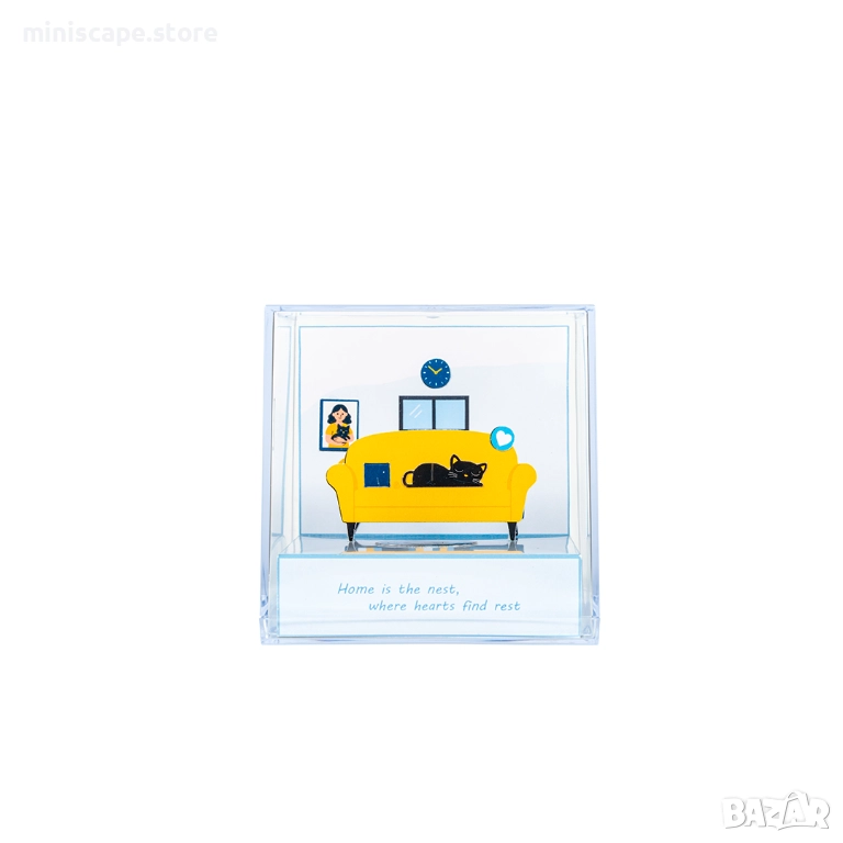 Потопи се в свят на спокойствие и мек уют с диорамата Home is the Nest. Комфортен диван, котка, сгушена в тишината, и нежната атмосфера на дневната пресъздават простичката магия на това да бъдеш у дома. Всеки елемент приканва да спреш за момент, да си поемеш въздух и да си спомниш, че истинският уют се крие в дребните жестове и детайли.