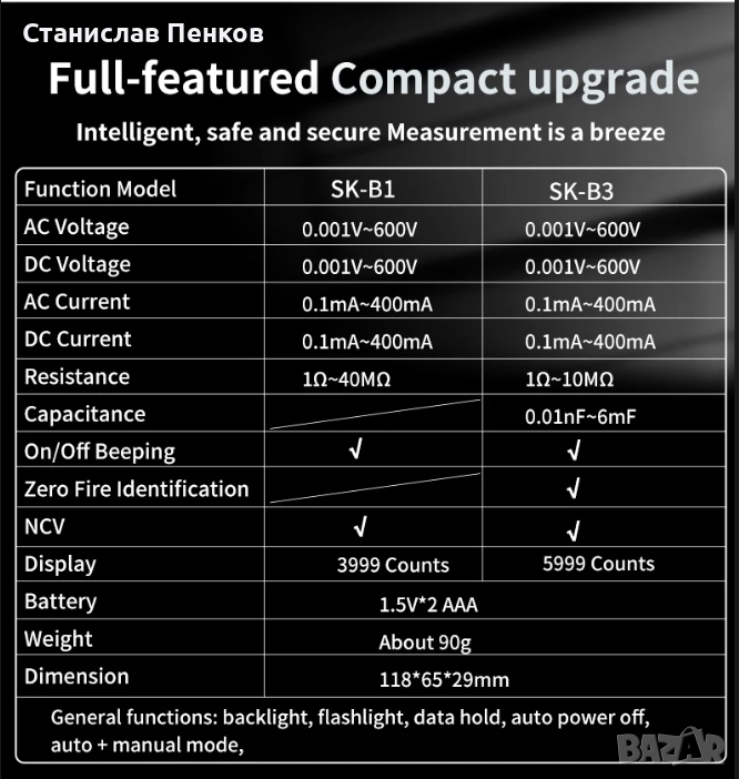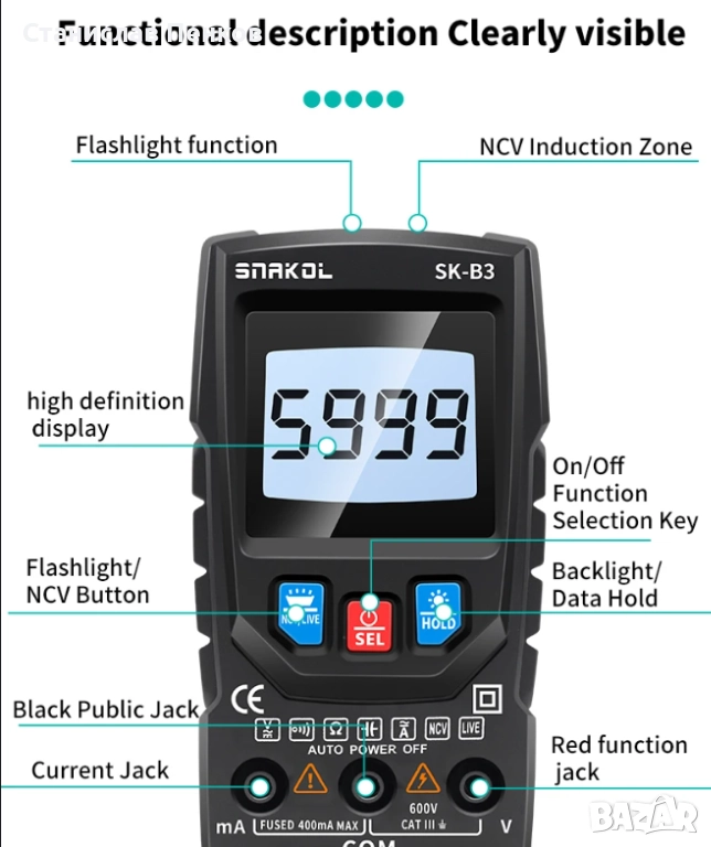 Многофункционален цифров мултицет: SK-B3 е преносим цифров интелигентен мултицет с 3999 броя, който ви позволява бързо да превключвате между всички измервателни задачи, включително AC/DC напрежение/ток, съпротивление и тестване за непрекъснатост, без да избирате режим или обхват.
