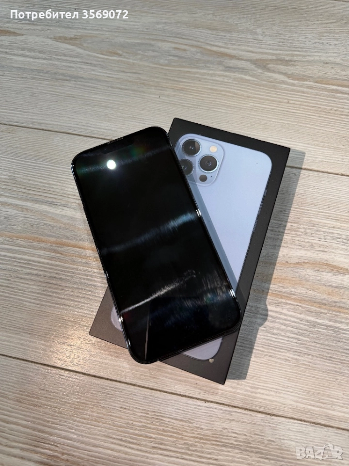 Продавам iPhone 13 Pro Max в цвят Sierra Blue с памет 256 GB. Телефонът е използван, но е в перфектно състояние – без никакви забележки по корпуса или дисплея. От първия ден е с поставен стъклен протектор, който все още е на него.