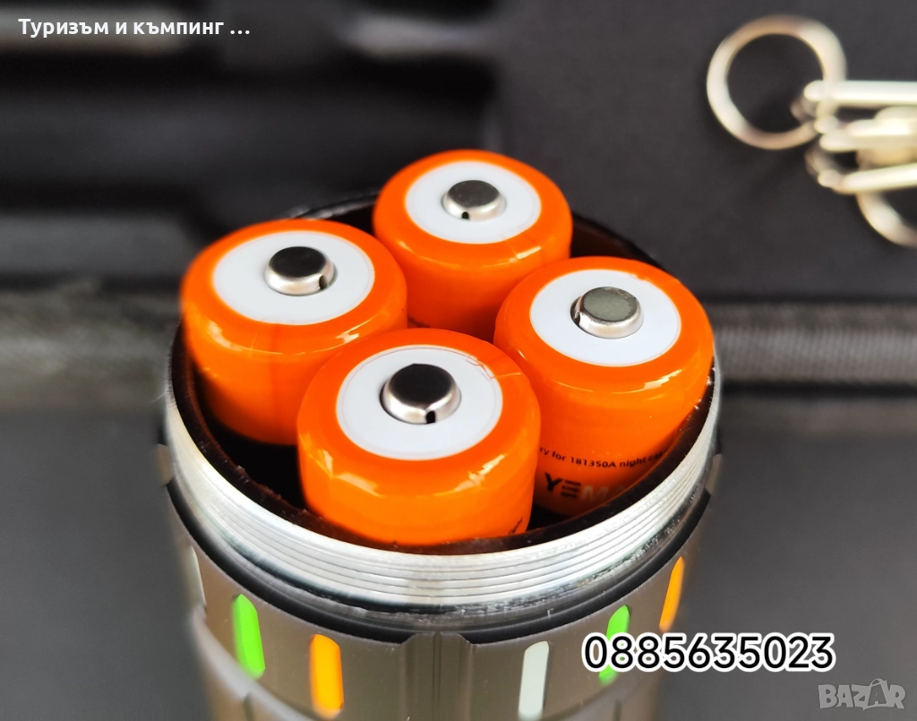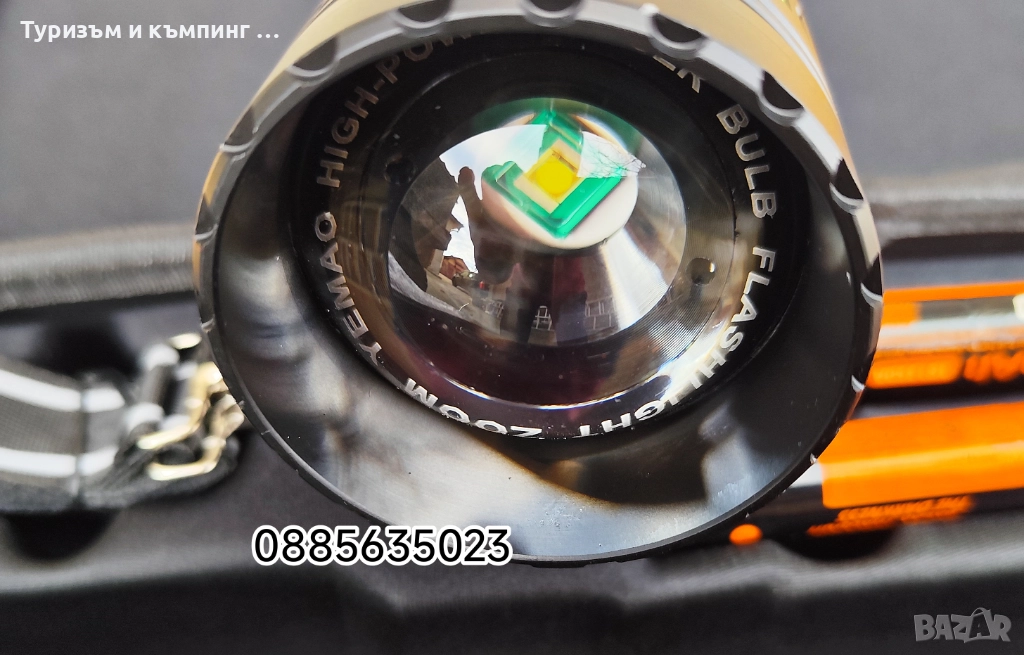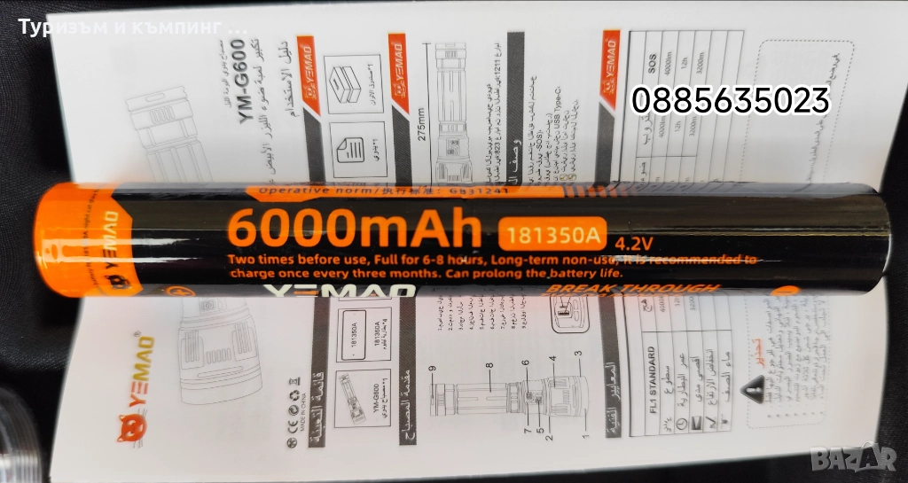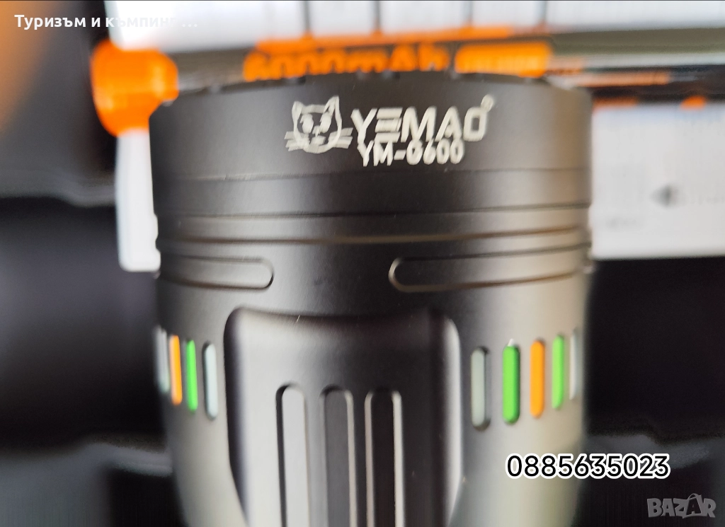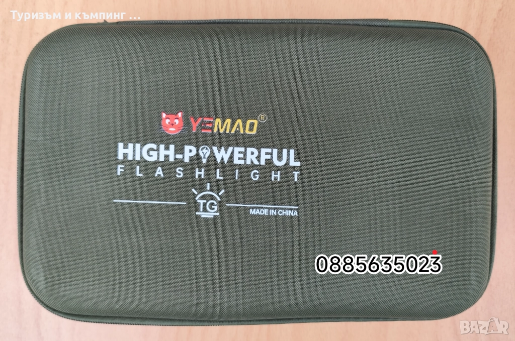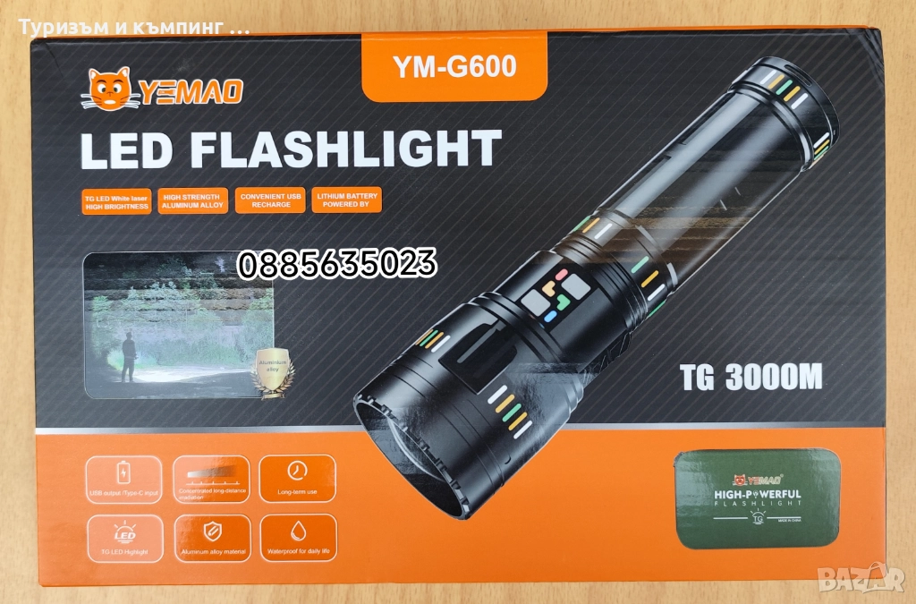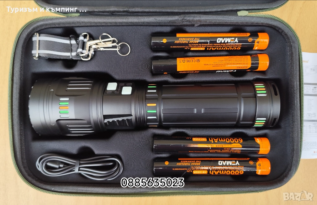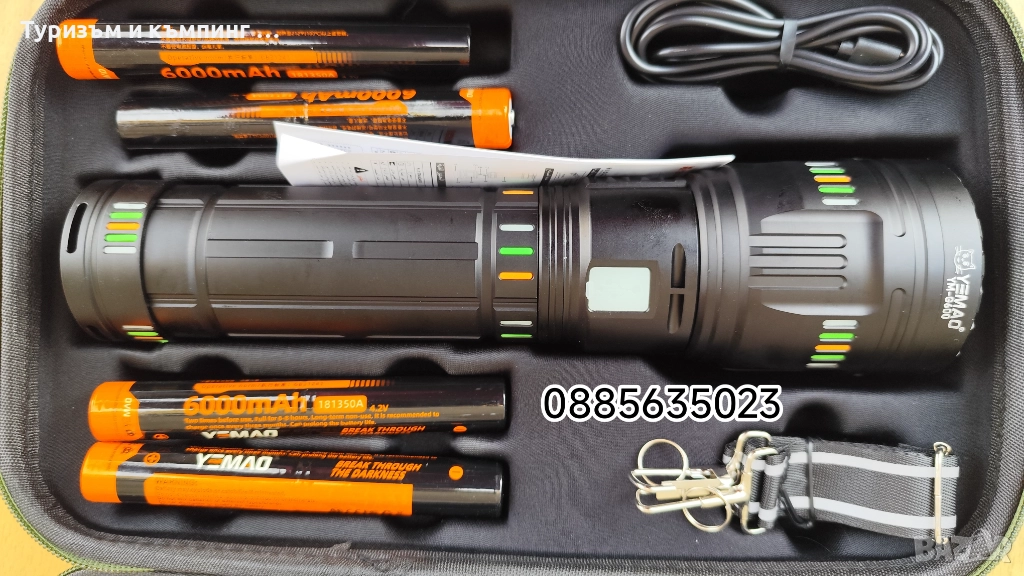 Това е мощен акумулаторен LED фенер Yemao YM-G600, който се предлага в комплект с батерии и калъф за съхранение.