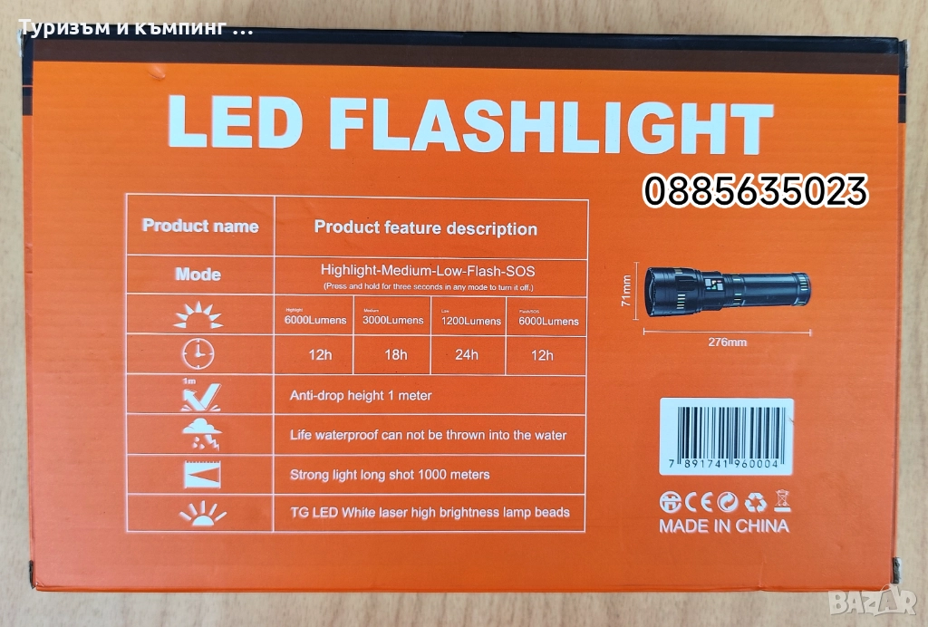 Режими на светене: Разполага с няколко режима на работа, включително силна, средна, слаба светлина, както и SOS и/или стробоскопичен режим.