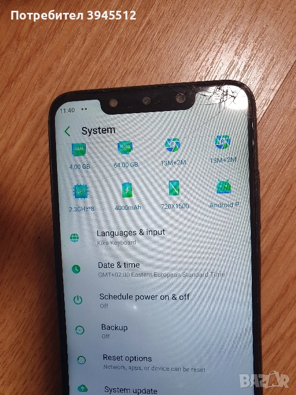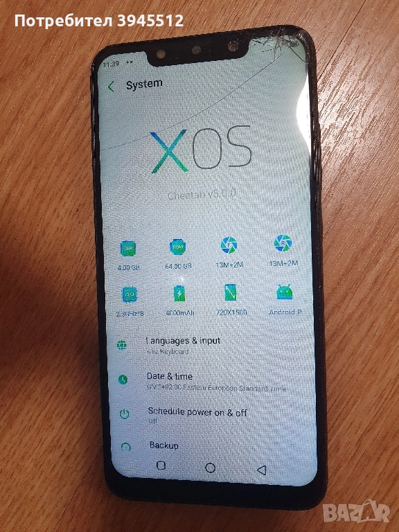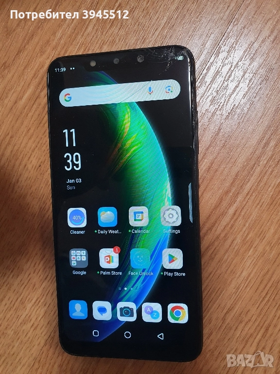 Телефона е със счупено стъкло на дисплея и външни забележки.