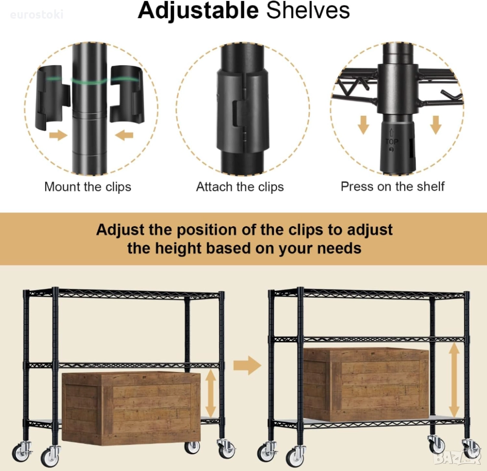 Предлага се с 4 колела (2 със спирачка) за по-добра мобилност и 4 регулируеми крачета за по-голяма стабилност на неравен терен. Товароносимост: с нивелиращите крачета, рафтът може да издържи до 430 кг. Общата товароносимост при използване на колелата е най-малко 200 кг.