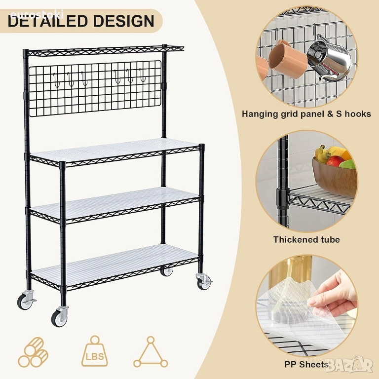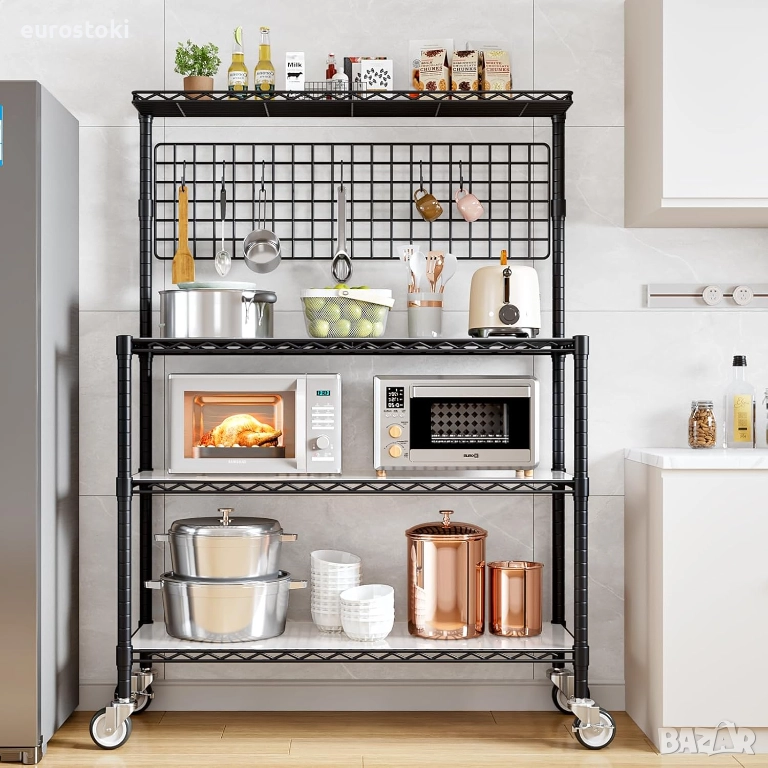Регулируем кухненски рафт с 4 нива: с 4 метални рафта, които са по-широки от повечето конвенционални модели, този рафт за микровълнова фурна осигурява достатъчно място за две конвенционални фурни една до друга и позволява подреждането на кафемашина и микровълнова фурна. Той също така разполага с удобен рафт за окачване и полурафт за съхранение на повече кухненски прибори.