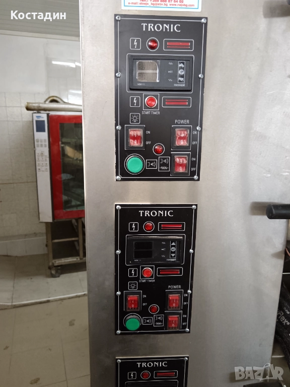 Фурна за хляб, закуски и др. С шамотни плочи, събира 18 тави 60/40 или около 60 хляба на табан. Има количка със 8 зареждача и аспирационен чадър с вентилатор. Ползвана е около 9 месеца.