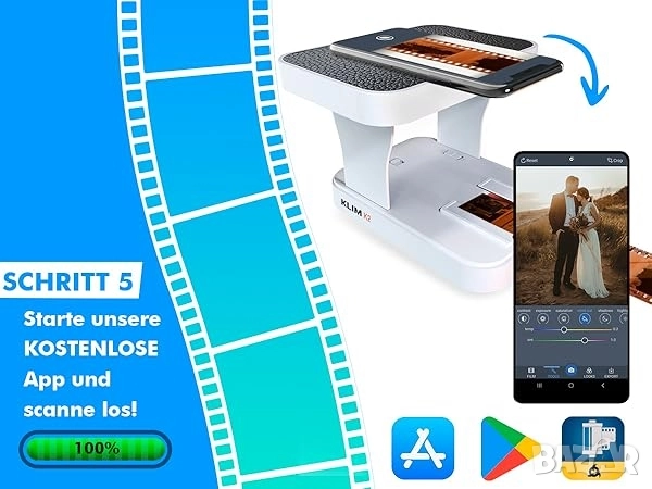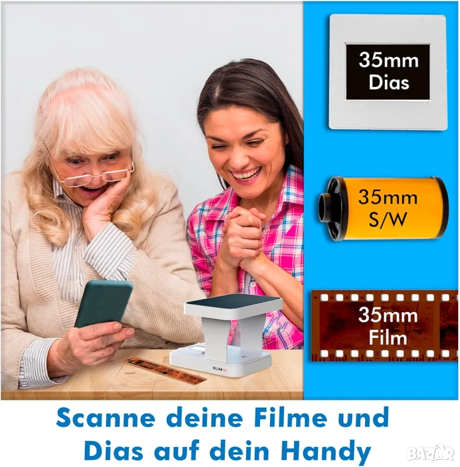 мобилен скенер за филми, сканиране на негативи, 35мм лента, дигитализиране на диапозитиви, скенер за стари снимки, KLIM K2, фото аксесоари, преобразуване на негативи, фото скенер за телефон, digital film scanner.