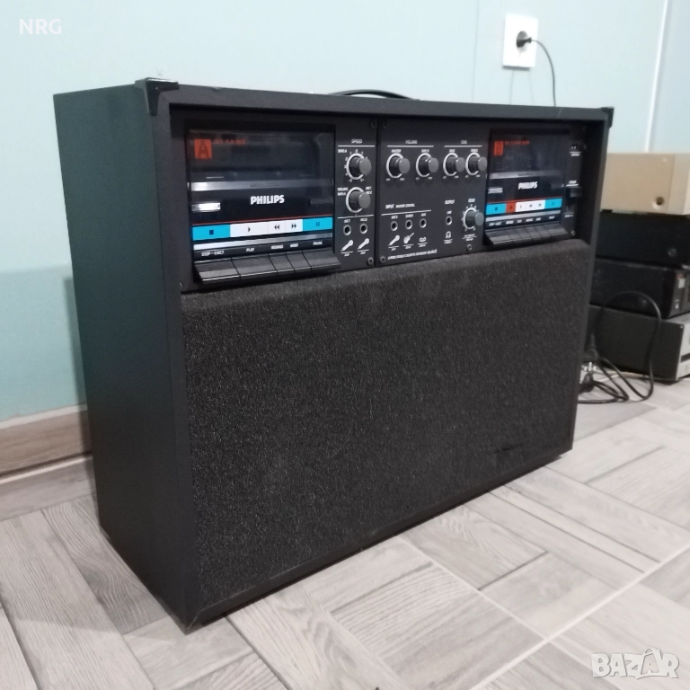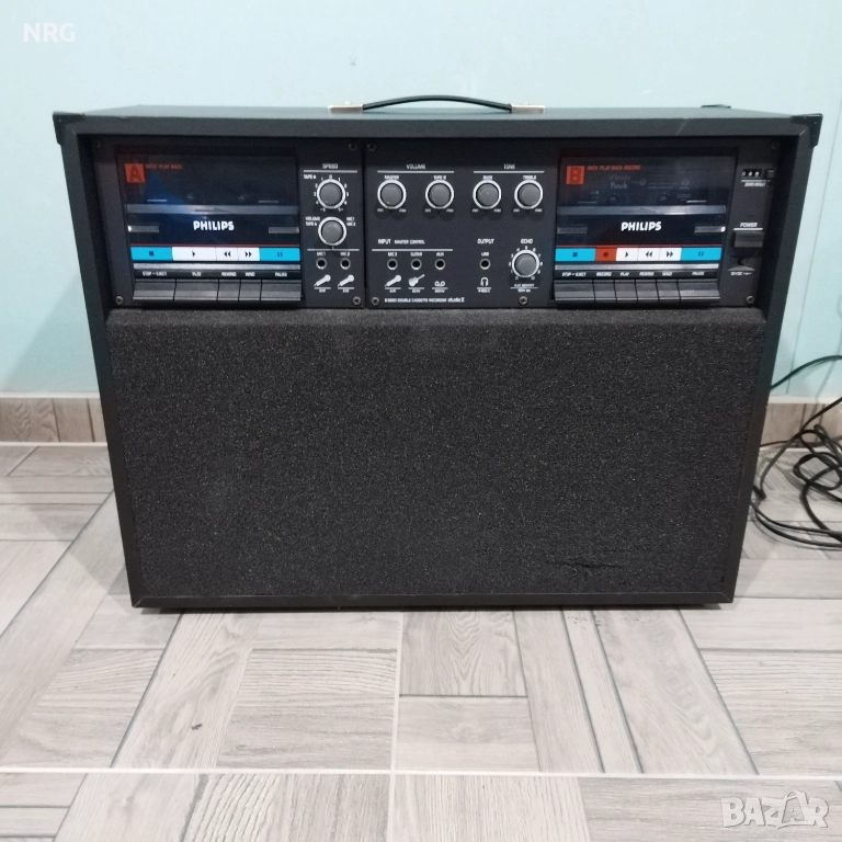 Произведен 1989 година!Като чисто нов и напълно работещ!Двоен дек с регулиране на скоростта на гнездо А. Възможност за включване на 3 микрофона,китара,слушалки и AUX. Ехо ефект, регулиране на ниски и високи. Възможност за външно захранване 12 волта. Тегло 9 кг. Размери 580/460/210 мм.