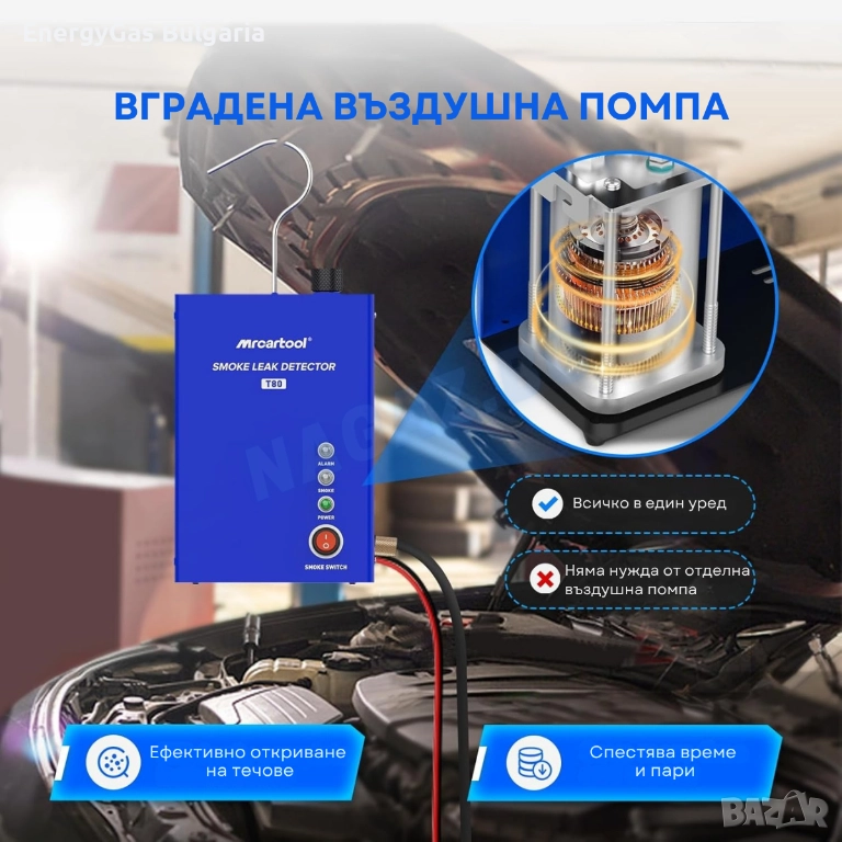 Бързо открива течове във въздуховодната система на всички 12V автомобили, мотоциклети, снегомобили, моторни лодки и др.