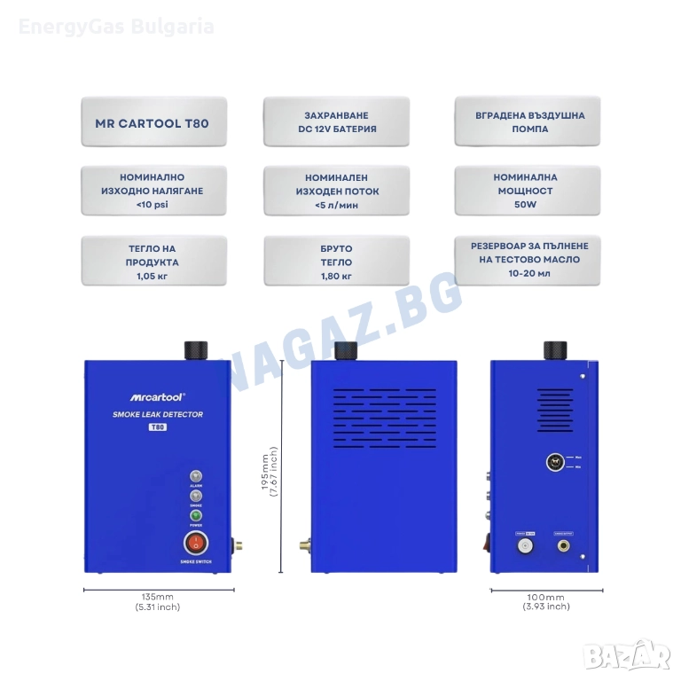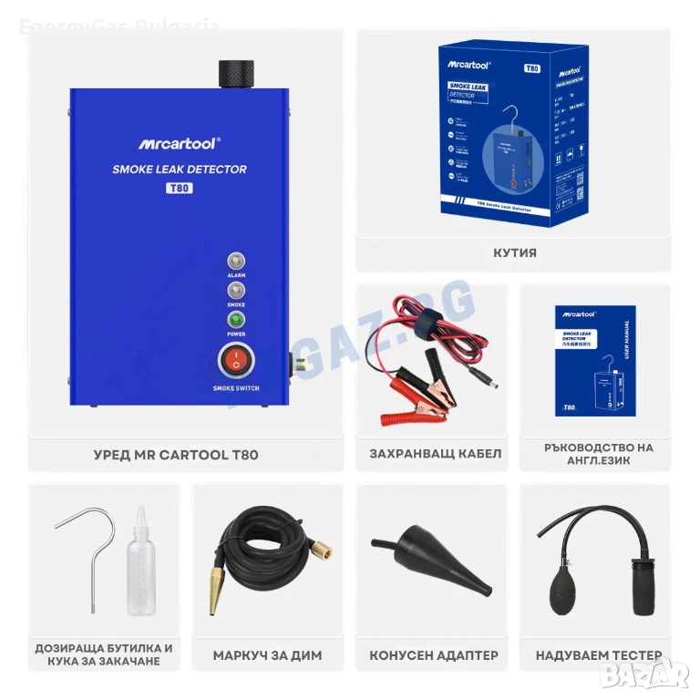 Детекторът за течове MRCARTOOL T80 е професионална машина за откриване на течове в автомобилни тръбопроводи. Може да се използва за всмукателна система, уплътняване на автомобили, изпускателна система, система за резервоар за гориво и различни тръбни фитинги.
