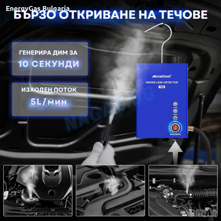 МОЩЕН И ЛЕСЕН ЗА УПОТРЕБА – проектиран е с кука, така че можете да окачите димната машина под капака, което го прави отличен избор за откриване на течове в превозното ви средство. Детекторът за течове е малък, но има мощни функции, трябва само да свържете детектора към устройството, да натиснете бутона „Старт“ и 10 секунди след излизането на дим, бързо да локализирате течовете от тръбопровода на автомобила. Номинален дебит 5L/min.
