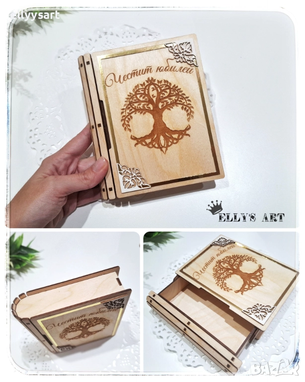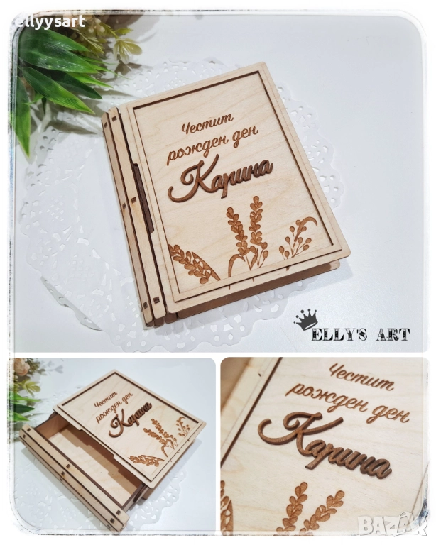 Дървена гравирана картичка под формата на книга → Обява 52517427