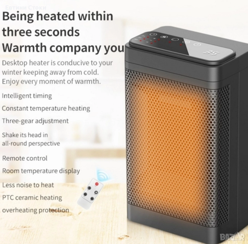 В комплекта: отоплител, дистанционно с батерия CR2025, упътване.