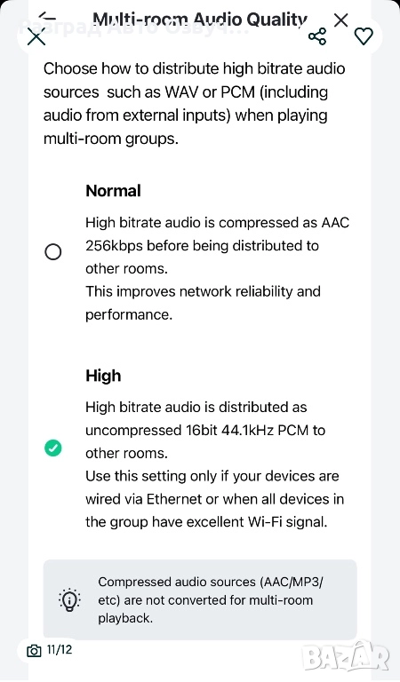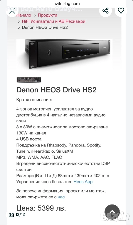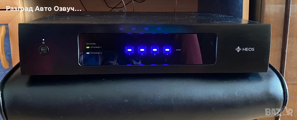 Продавам специален модел, един много качествен усилвател на марката Denon Heos. Усилвателя има 4 зони които са независими един от друг, има по 2 канала на зона. Усилвателя се управлява от приложението на Heos което се тегли на телефона. Има страшно много екстри и настройки в приложението, има достъп до световни радио станции, на Spotify, на Deezer и още много платформи за музика. Има също така избор на висококачествен звук или средно качествен. Когато се избира високо качествения звук, звука става кристално чист и наистина много много качествен. 4 те зони на усилвателя можете да свързвате на 4 отделни стаи от къщата и на всяка една стая да пускате различна музика. С една дума имате 4 усилвателя вградени в една.